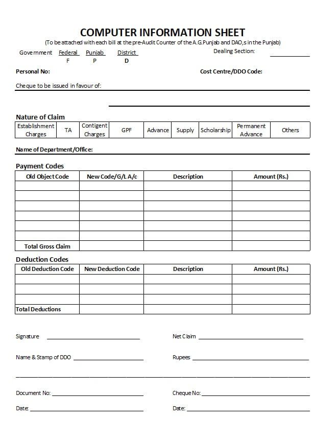 Share Facebook WhatsApp Email Copy Link Computer Information Sheet for District Account Office. It is used to pay bills in District Account Offices. dOWNLOAD COMPUTER INFORMATION SHEET EXCEL dOWNLOAD COMPUTER INFORMATION SHEET WORD dOWNLOAD COMPUTER INFORMATION SHEET PDF Related Documents Pay Bill for Gazzeted Pay Bill for Non-Gazzeted Computer Information Sheet CC Bill LPC Change Form Adjustment Codes computer information sheet computer sheet computer sheet pdf pifra computer sheet