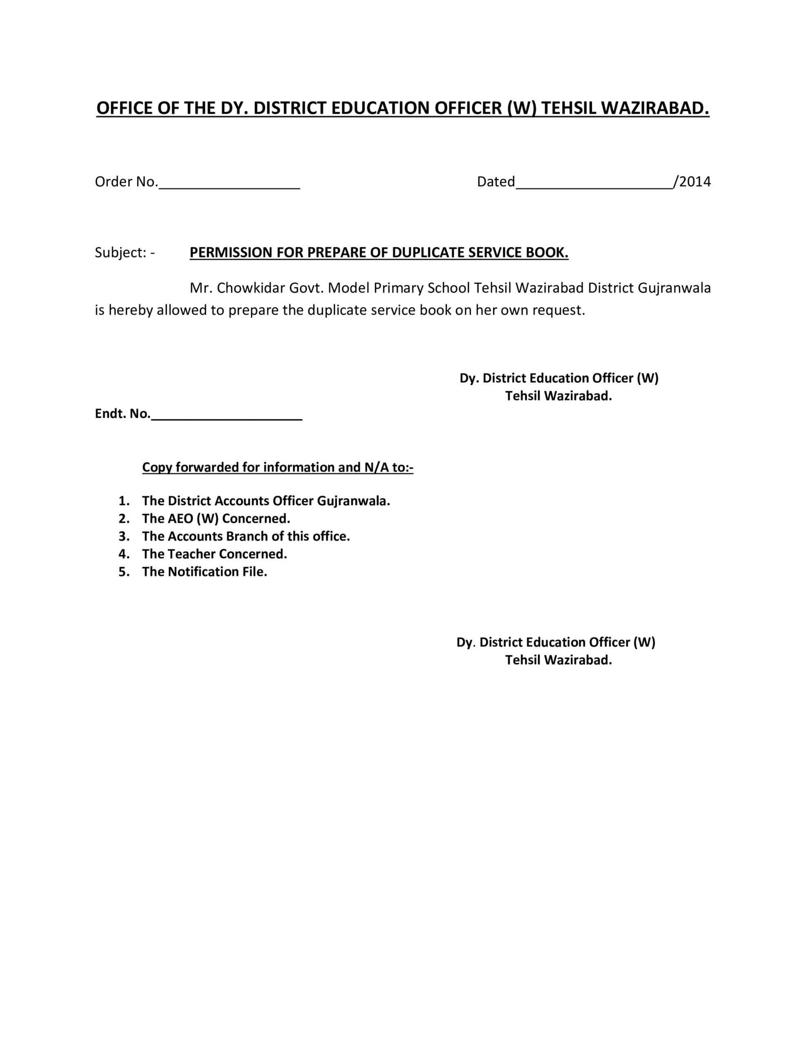 Mr. ___________________ Chowkidar Govt. Model Primary School Tehsil Wazirabad District Gujranwala is hereby allowed to prepare the duplicate service book at her own request.